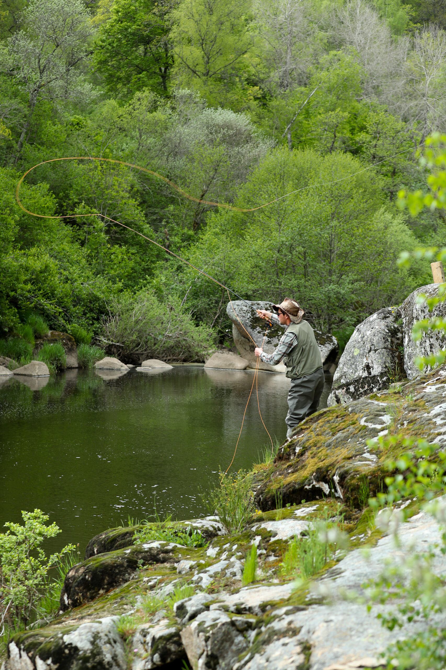 « J’ai commencé à pêcher dans le Brezons, une rivière qui se trouve vers Pierrefort », chuchote Arthur. « Depuis toujours je suis fasciné par ce sentiment d’être seul face à la nature et de retrouver le côté apaisant de l’eau. La pêche nous renvoie à notre instinct de chasseurs et de pêcheurs. Nos sens sont en éveil : l’ouïe pour guetter le clapotis de l’eau quand les poissons montent à la surface ; la vue pour faire attention aux ombres, aux reflets, à la lumière. Il n’y a pas de détail dans la pêche, tout compte ! C’est d’ailleurs ce qui plaît aux enfants que j’initie à la pêche. Ils ont en eux cet instinct, prêt à s’éveiller instantanément et cet émerveillement face à la nature ! ».