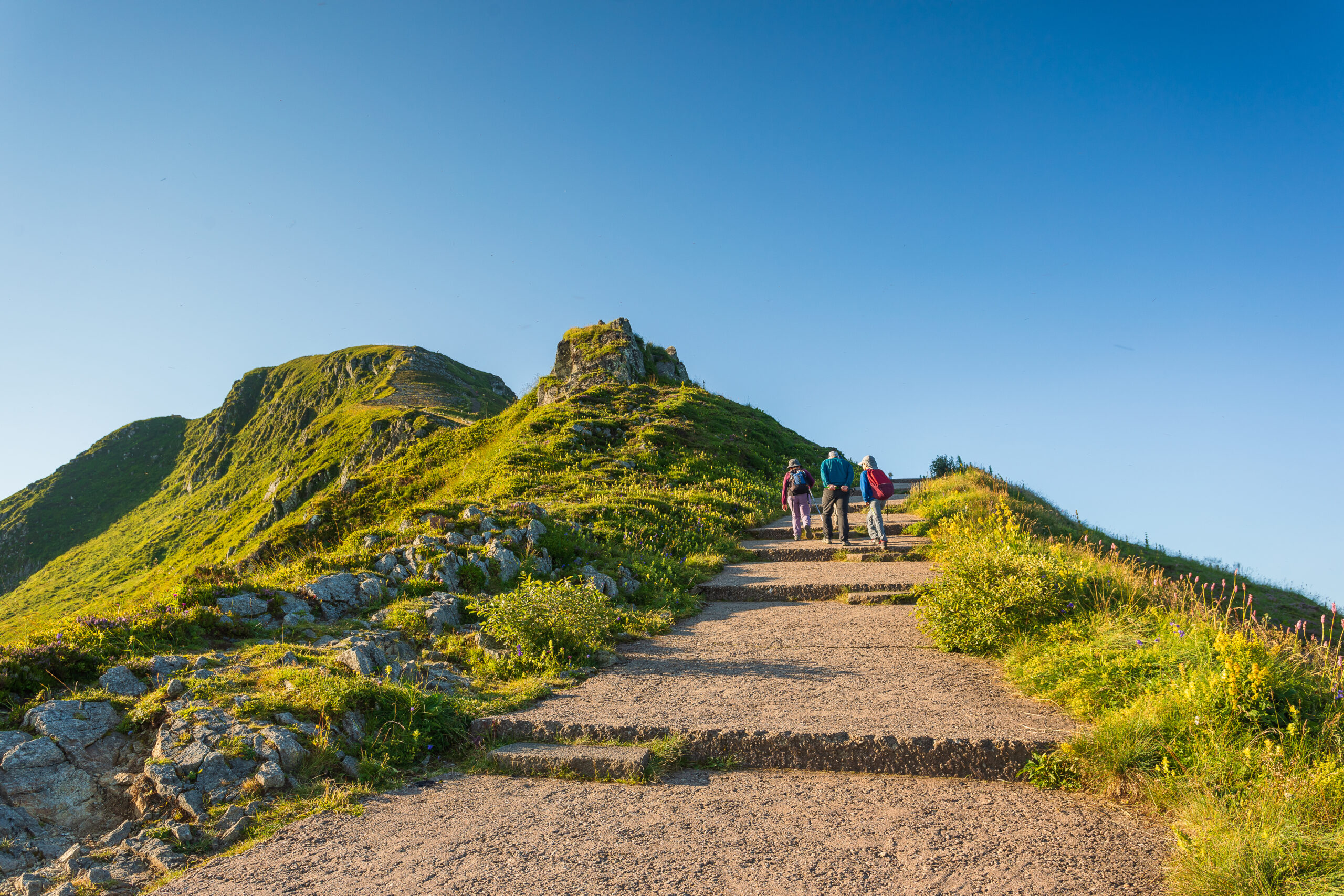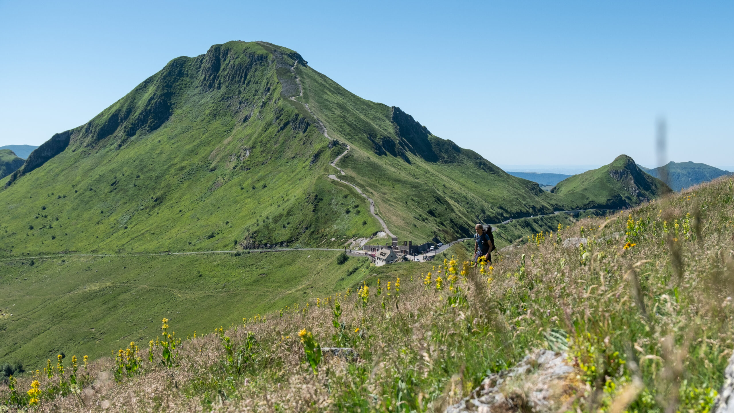 Votre aventure commence au Pas de Peyrol, le plus haut col routier du Massif central. Dès que vous quittez la route, le paysage s’ouvre comme un livre d’histoire géologique. Devant vous, le sentier serpente vers le sommet. Trente minutes suffisent pour atteindre ce belvédère volcanique, mais chaque pas est une immersion. Le dénivelé est d’environ 150 mètres. Le chemin est aménagé avec des marches en pierre, et certains randonneurs apprécient l’aide de bâtons pour franchir les passages plus raides. Une fois là-haut, la récompense est immense : un panorama à 360°, des crêtes volcaniques à perte de vue, et par temps clair, la silhouette du Mont Blanc à l’horizon.