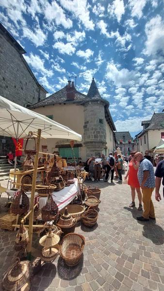 * Place de Peyre : stand de l’association "Montsalvy Fête des Paniers", point de vente, informations, atelier de vannerie, maquillage, caricaturiste