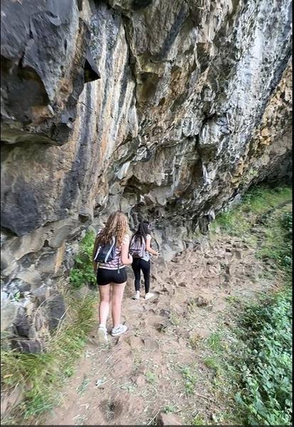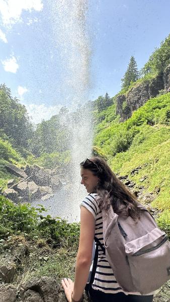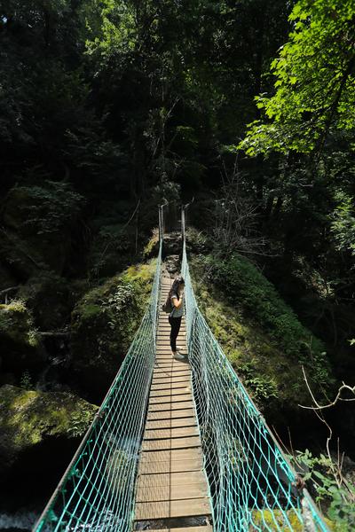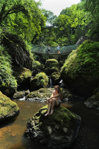 Lorsque l’on passe derrière celle-ci, par un petit chemin aménagé, tout en longeant des orgues basaltiques, on remarque une cavité où une source jaillit : « la fontaine des druides ». En poursuivant le sentier de randonnée (3 km-1h30) on rejoint par un pont de singe un autre ruisseau, le Monzola, affluent de la rivière.