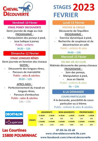 Stages d'équitation pendant les vacances de février en demi-journée , ouvert à tous, cavaliers novices ou initiés. détail du programme disponible à l'Office de Tourisme ou auprès de Cheval Découverte.