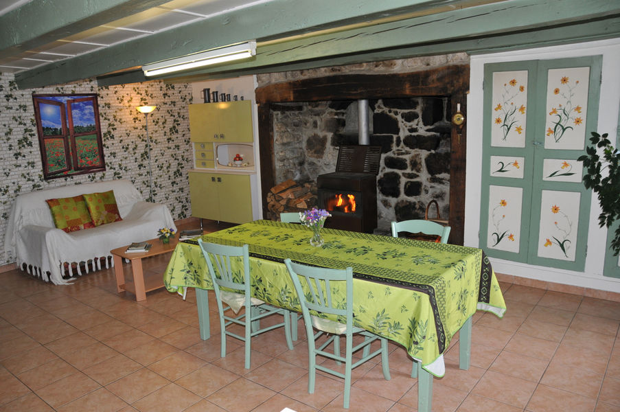 La maison se compose : au rez-de-chaussée : grand séjour (35m²) avec ouvertures plein sud donnant sur terrasse avec vue panoramique sur le Cézallier, cheminée avec insert (bois gratuit), cuisine équipée, salle d'eau et WC indépendant. A l'étage : deux chambres : deux lits 140, un lit 90.