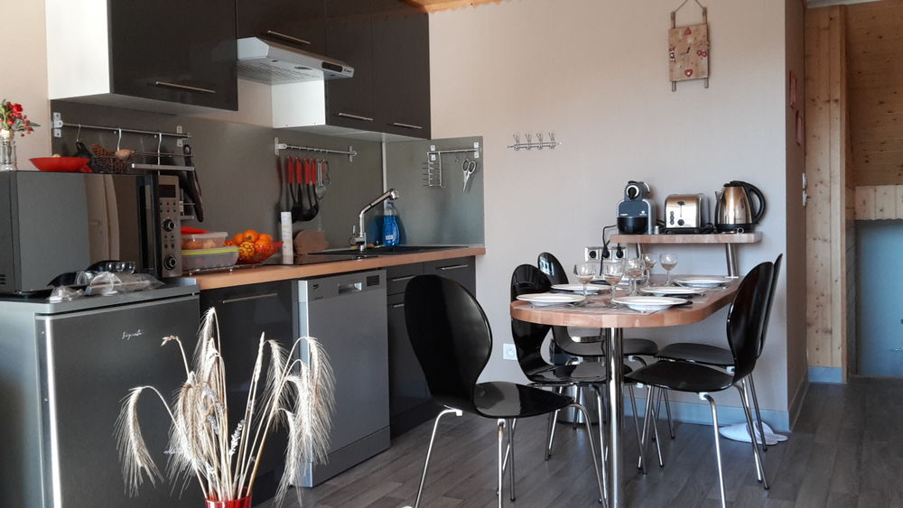 Cuisine équipée : lave-vaisselle, four combiné micro-ondes, réfrigérateur avec conservateur, appareil à fondue, cafetière et machine Nespresso, grille-pain, bouilloire, fond de cuisine, blender, presse-agrumes.