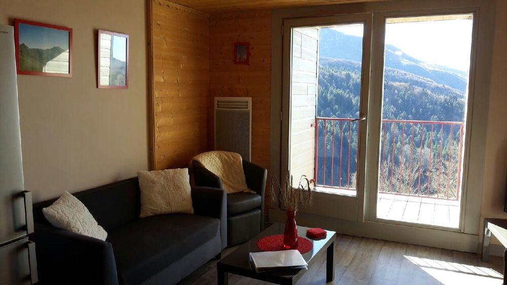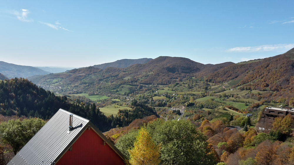 Grand séjour avec balcon : vue imprenable sur les monts du Cantal et la vallée de la Cère, exposé plein sud.