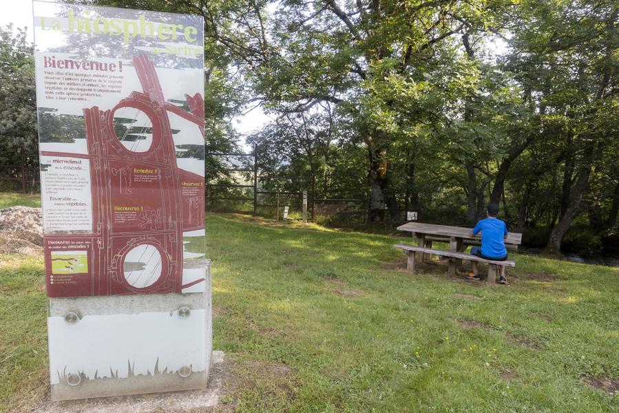 À notre arrivée sur le site de la cascade du Sartre, on semble pénétrer une bulle de biosphère. En effet, la structure métallique qui a été conçue pour plus de sécurité sur le site est de forme sphérique et permet aux visiteurs de plonger au cœur de la cascade à l’aide d’outils d’observation et de découverte sensorielle.