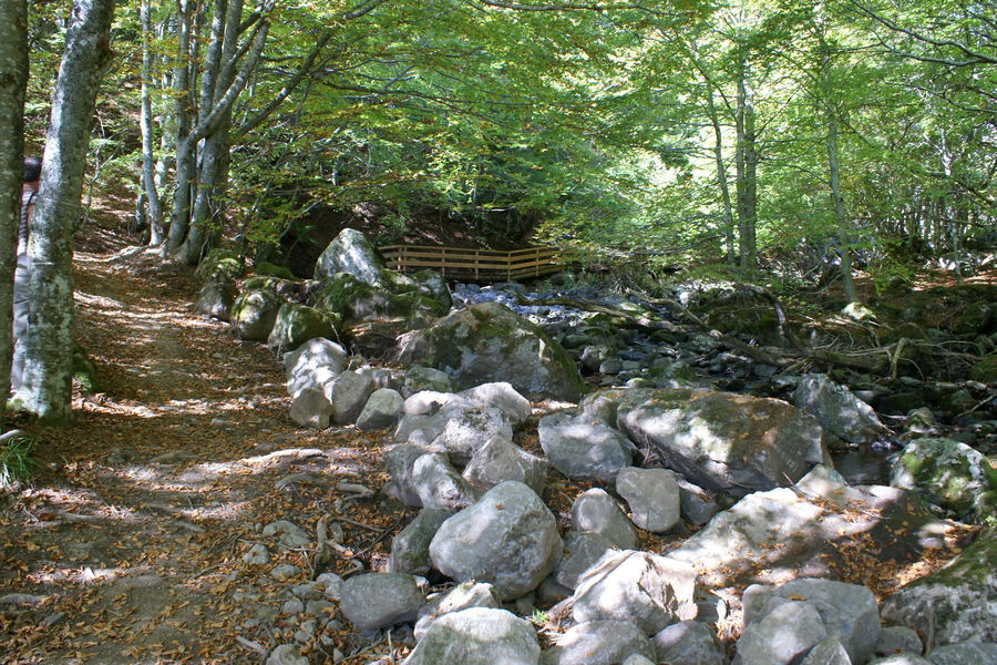 Accès par un chemin pittoresque entre des murets de pierre sous des hêtres centenaires. Aménagement avec des passerelles en bois.