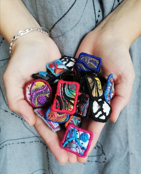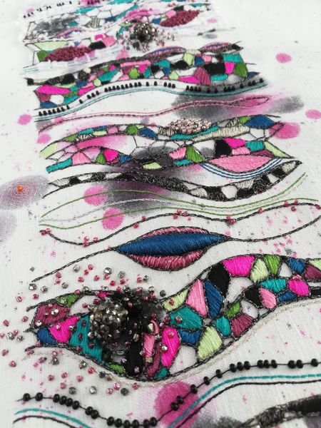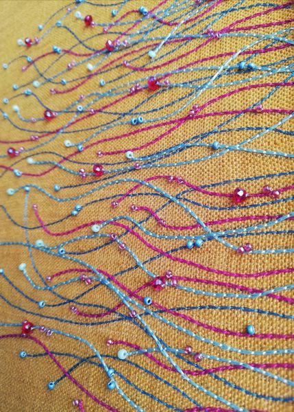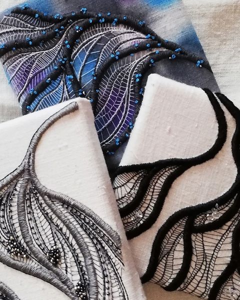 Créations contemporaines de pièces uniques brodées à la main à l'aiguille et au crochet de Lunéville.
