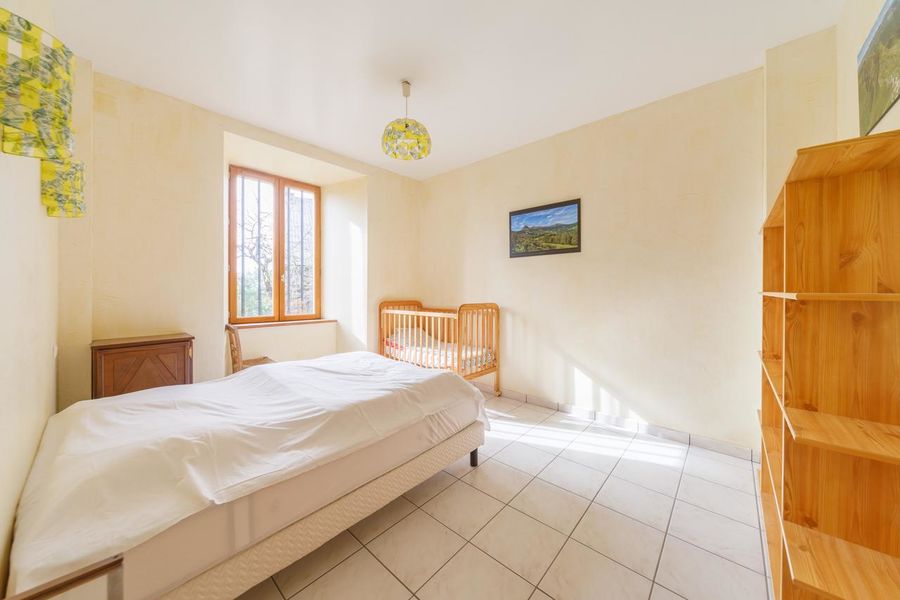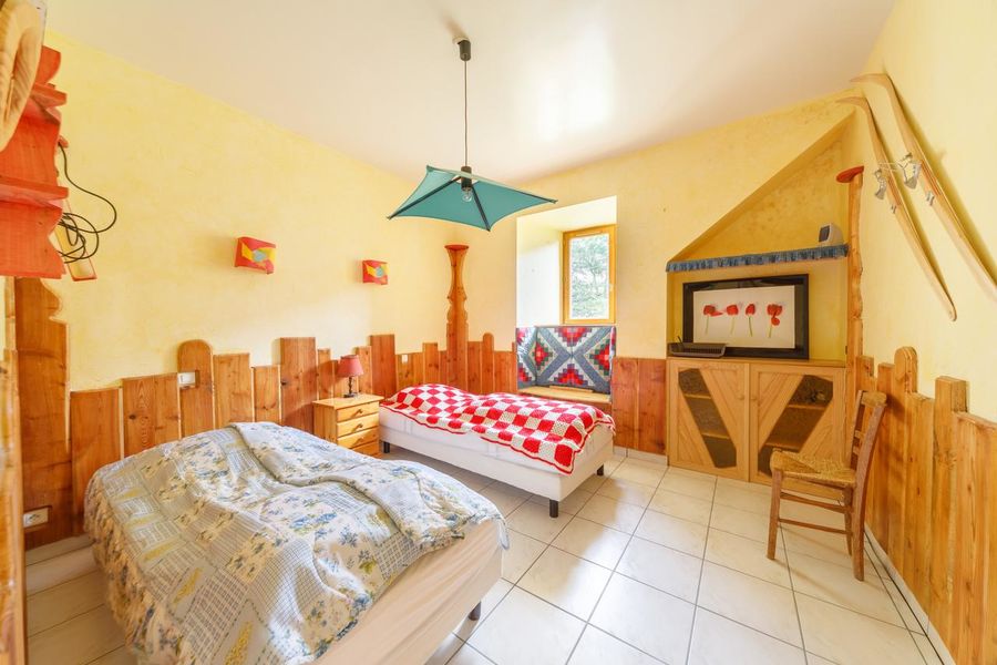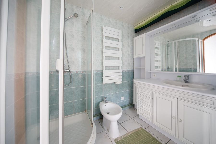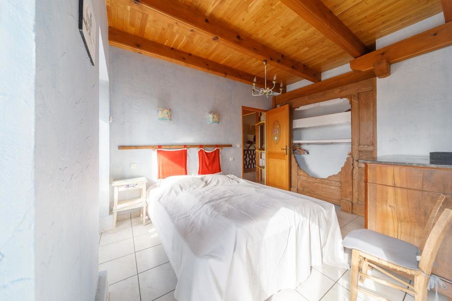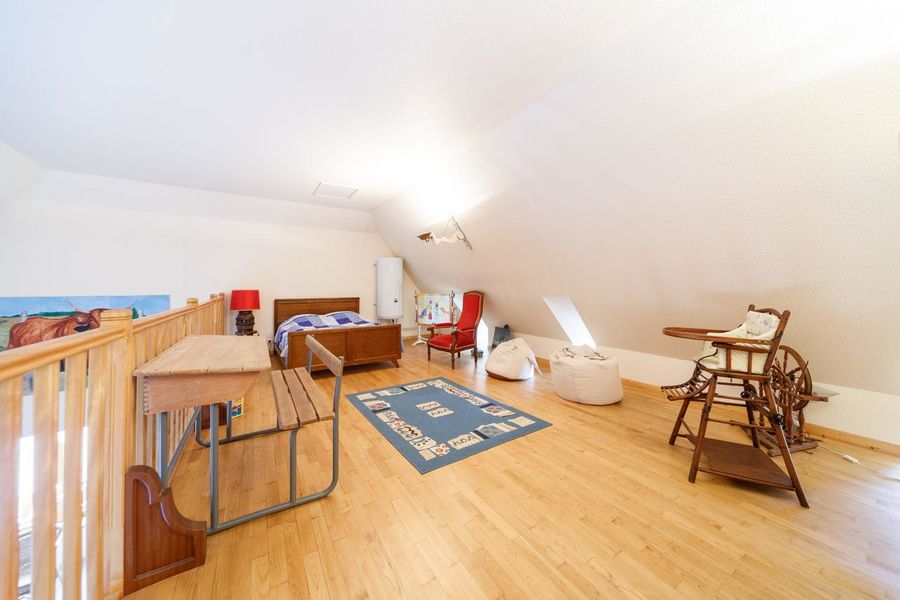 La maison présente 130 m2 sur 3 niveaux dont une mezzanine avec 3 chambres ( 3GL-2 PL), 2 salles de bain et 2 WC séparés. Chauffage électrique au sol – Cheminée (Insert) : bois à disposition