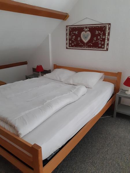 Chambre avec 2 lits superposés 90, un lit 90 et un lit gigogne, en mezzanine : 1 lit 140.