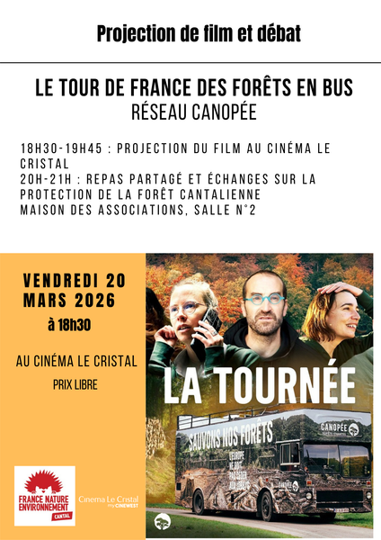 L'équipe des bénévoles de France Nature Environnement Cantal organise une soirée projection/discussion, sur le thème de la protection et de la sauvegarde de nos forêts, le 20 mars prochain, à 18h30 au cinéma le Cristal à Aurillac. Dans le cadre de son engagement en faveur de la préservation de l'environnement, FNE-Cantal organise une soirée projection/discussion. Cet événement se déroulera le 20 mars 2026, en deux temps : de 18h30 à 19h45/20h au cinéma le Cristal d'Aurillac, avec la projection du film « La tournée », un tour de France des forêts, réalisé par l'association Canopée Forêts Vivantes, suivie d'une discussion avec le public, et de 20h à 21h, à la salle n°2 de la Maison des associations d'Aurillac, (juste en face du cinéma) pour prolonger la discussion autour d'un repas partagé façon auberge espagnole. Cette animation s'adresse à toutes les personnes qui souhaitent s'informer, se renseigner et/ou s'impliquer concrètement dans la préservation des forêts, de la nature, du vivant et de notre cadre de vie dans le Cantal. Les personnes qui souhaitent s'engager, pourront rejoindre, notre équipe de bénévoles, dans un cadre dynamique et bienveillant, pour élaborer ensemble, des projets qui font la différence, au sein de notre association FNE – Cantal.