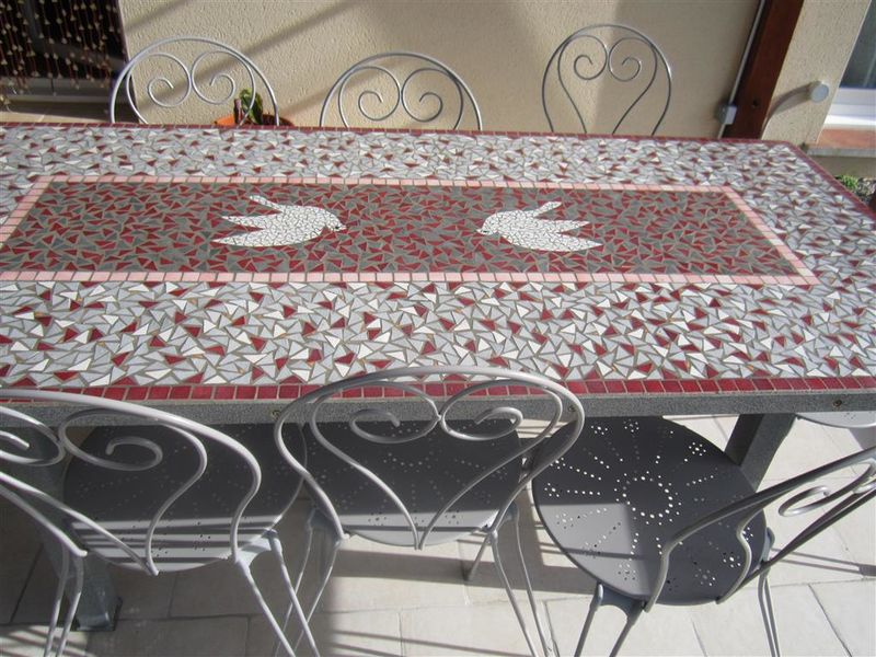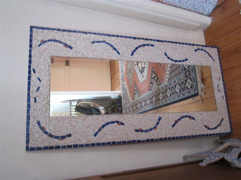 Colette crée des miroirs, tables basses, table de jardin et tout type de décoration intérieure en mosaïque avec des carreaux de Briare…