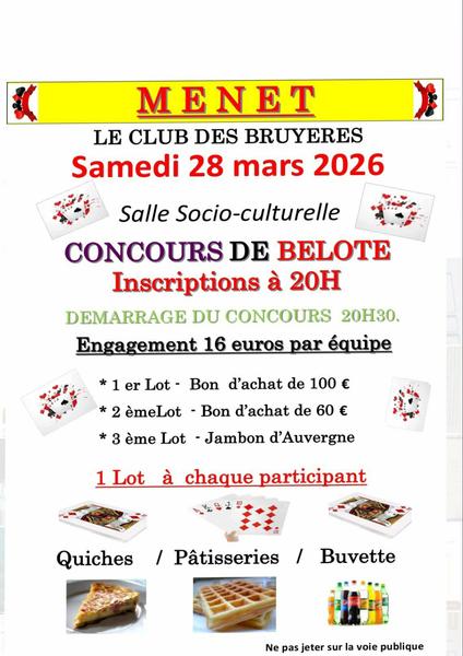 Le Club des Bruyères organise un concours de belote, le samedi 28 mars dès 20h à la salle socio-culturelle de Menet !