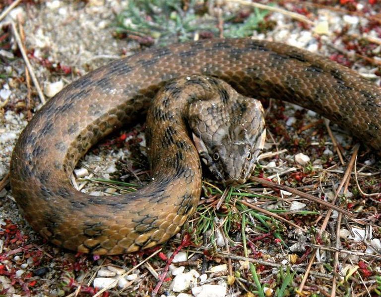 Nom scientifique : Natrix maura. Serpent aquatique diurne, marron ou grisâtre, teinté de jaune olivâtre ou de rouge. Longueur : 0,7 (mâle) à 1m (femelle). Habitat : Cours d’eau, zone humide à température chaude. Sud-ouest de l’Europe, ouest de l’Afrique du Nord. Reproduction : 3 à 16 oeufs au printemps. Alimentation : Petits poissons, amphibiens.