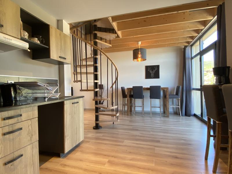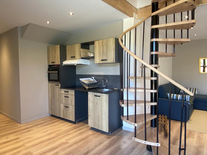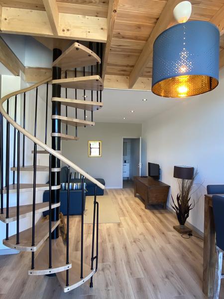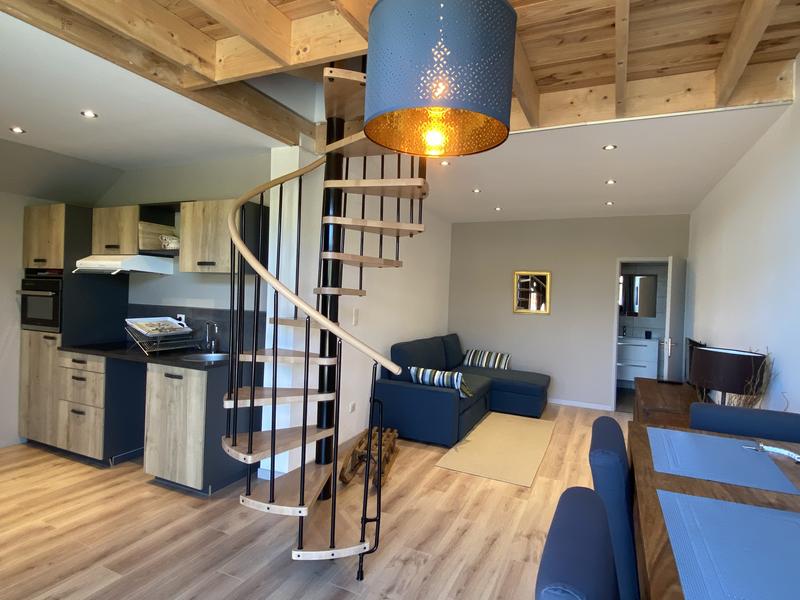 Vous trouverez dans le coin-couchage en mezzanine (accès par escalier colimaçon) 1 lit 2 personnes en 140×200. Dans le coin salon un canapé convertible est présent pour 2 personnes en 140×190. Le chauffage est central au gaz. Vous aurez l'accès à une buanderie commune avec lave-linge.