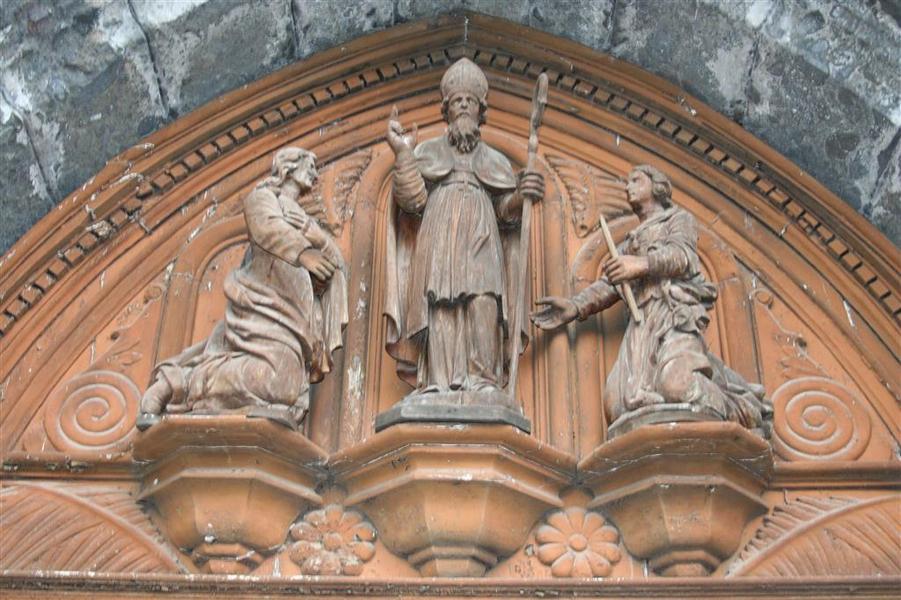 Dans la partie supérieure du portail, trois statues en bois peint du XVIIème.