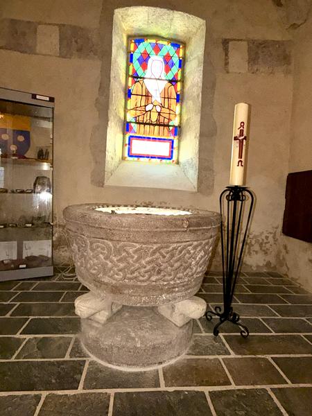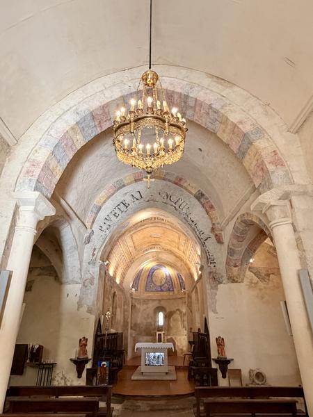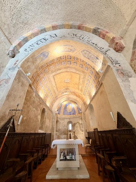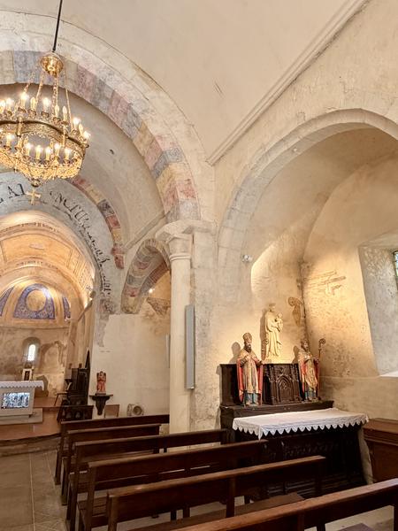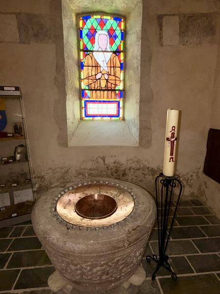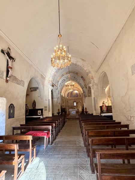 A découvrir, un ancien bénitier taillé dans un bloc cubique de marbre ou d’albâtre (peut-être est-ce une mesure à grains ou une mesure pour le plomb fondu). La cuve baptismale, en trachyte, classée MH, du XIIe est ornée d’entrelacs et repose sur 3 pieds-sculptures dont deux sont des lions. Au-dessus de la cuve, des petits tableaux évoquent la vie de Saint-Martin. Dans le chœur, les travaux de restauration récents ont fait apparaître de fort belles peintures datant du 17ème siècle.