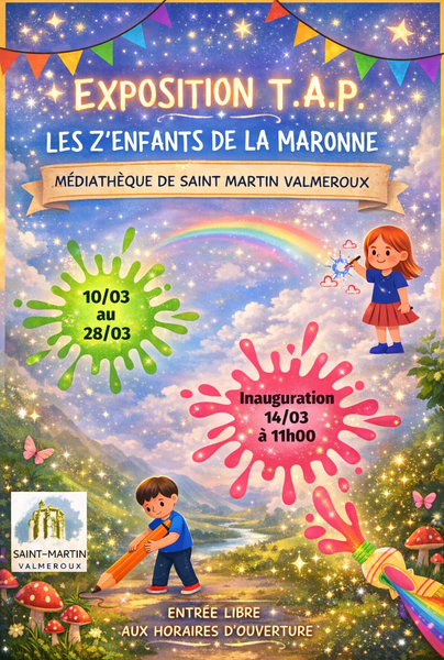 Les Z’enfants de la Maronne exposent à la médiathèque ! une exposition réalisée par le groupe des TAP « Les Z’enfants de la Maronne », présentant les différentes activités menées par les enfants de septembre à février.
