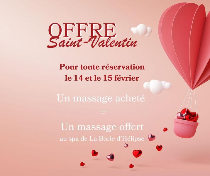 >Le 14 et le 15 février, pour un massage acheté, un massage identique est offert au spa de La Borie d'Hélipse (prestation identique, dans la limite des disponibilités).