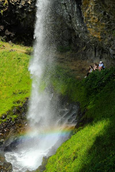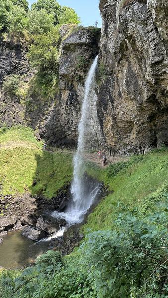 Derrière la cascade de Salins, une excavation apparaît avec un panneau indiquant "Font die Druidis guari la gourmo".