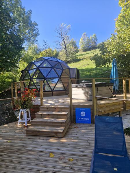 Nous vous accueillons dans nos hébergements insolites : dômes géodésiques conçus pour allier confort et respect de l'environnement pour une expérience unique au cœur des montagnes du Cantal. Vous profiterez d'une bulle de 20m², entièrement aménagée pour votre confort (coin cuisine, WC et douche intérieure, chauffage…) et d'une terrasse équipée d'un jacuzzi privé, chaises longues, table…