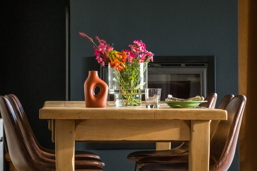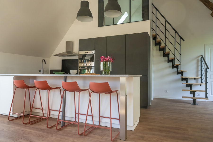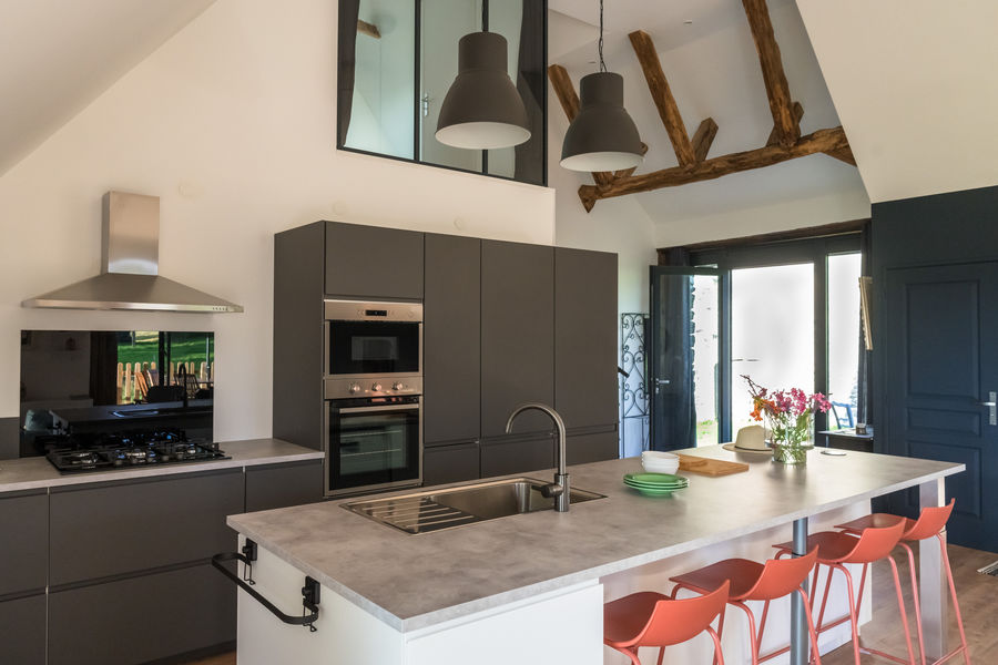 Grange rénovée en 2023, grande pièce de vie avec cuisine équipée (four électrique, micro-onde, lave vaisselle, plaque de cuisson gaz, réfrigérateur et congélateur).