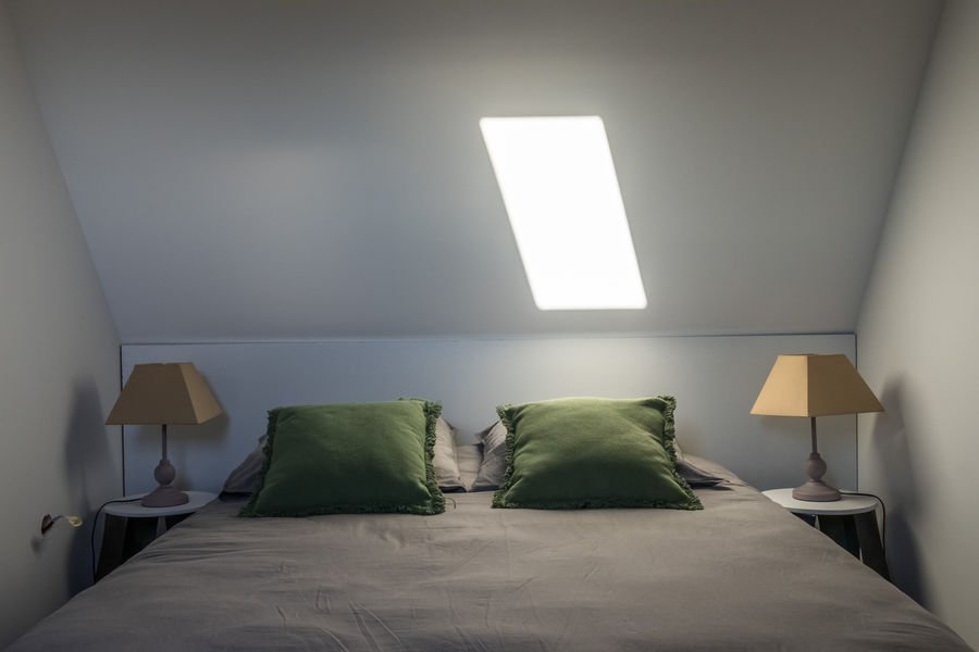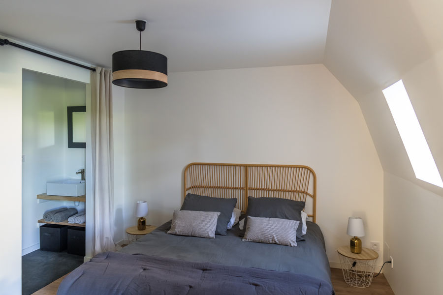 Une chambre mansardée à l'étage avec un lit en 140 et deux lits d'appoint en 90 et une salle d'eau.