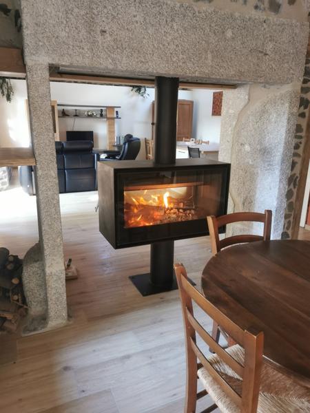 Un poêle à bois double face sépare la pièce d'entrée, équipée d'un canapé convertible (140×190) et la pièce à vivre.