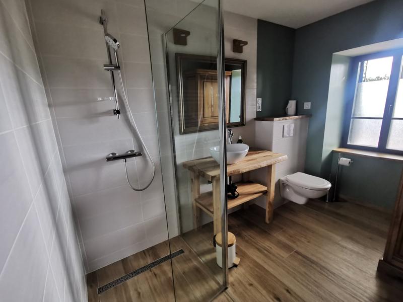 Salle d'eau, douche italienne, avec toilettes.