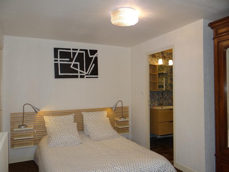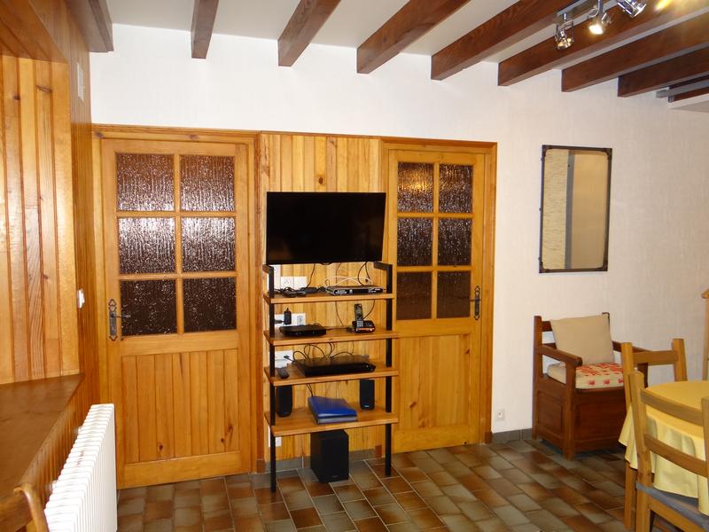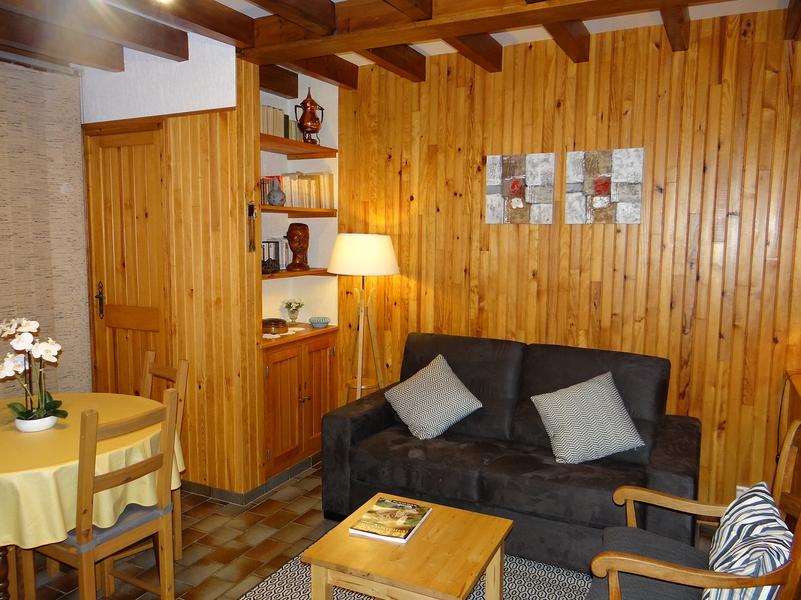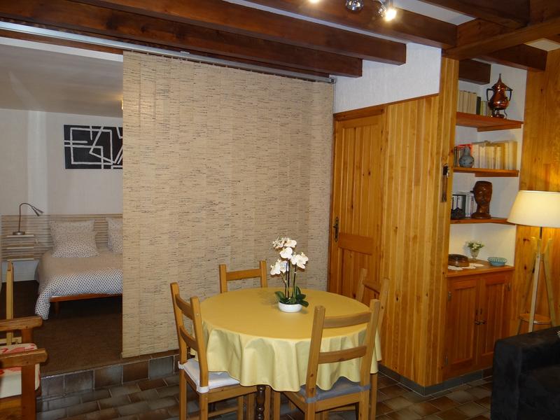 Ce gîte comprend une pièce principale composée de deux parties séparées par un claustra : espace chambre avec lit 160 (fait à l'arrivée) et salon/salle à manger avec convertible un canapé-lit 120.