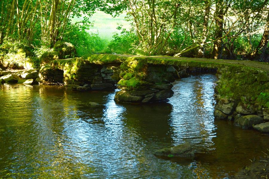 Arrivé aux premières maisons de Cueilhe, prenez à gauche, suivez tout droit, puis contournez le hameau. Vous rejoignez le chemin des mon­tagnes en prenant à gauche. Suivez-le sur 2 km. Enfin, vous apercevez, en face de vous, les Monts du Cantal. Vous butez dans une clôture à la perpen­diculaire du chemin, où se trouve une pierre et son béni­tier. Bifurquez à gauche pour dégringoler jusqu'au village de Caussac, en suivant le che­min principal. Suivez ensuite la D 59 à droite sur 150 m, et prenez la première à gauche entre les maisons, puis de nouveau à gauche pour trou­ver un joli sentier entre des murets. Vous descendez pour trouver la fraîcheur de l'Authre et traversez le pont romain d'Ontrigue.