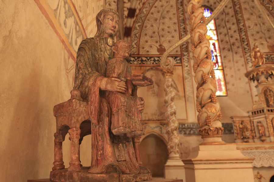 Baies ouvragées, vitraux et rosace, retable à colonnes torses et vignes dorées, s’ajoutent au sol ancien en pierre, l’escalier donnant accès aux combles, et au toit de lauzes typique.