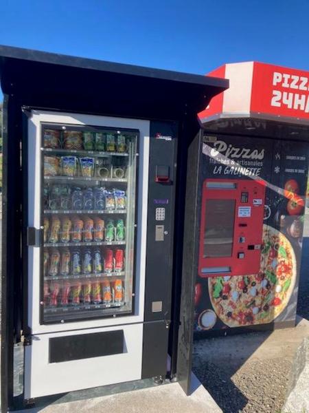 Distributeur de pizzas fraîches "smart pizza" et distributeur de boissons fraîches, accès libre 7j/7 et 24h/24.
