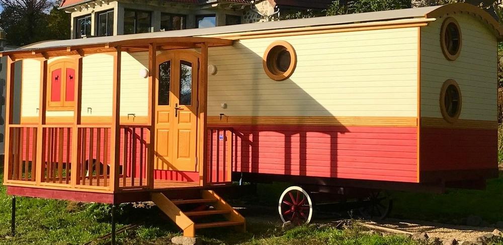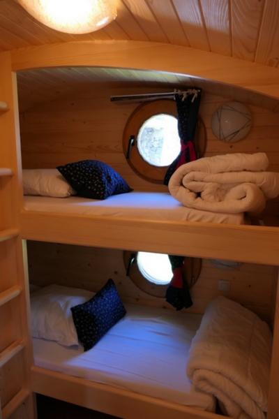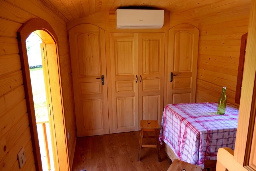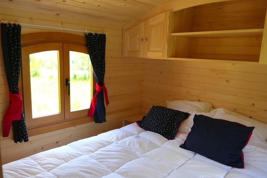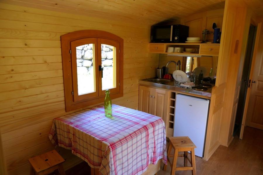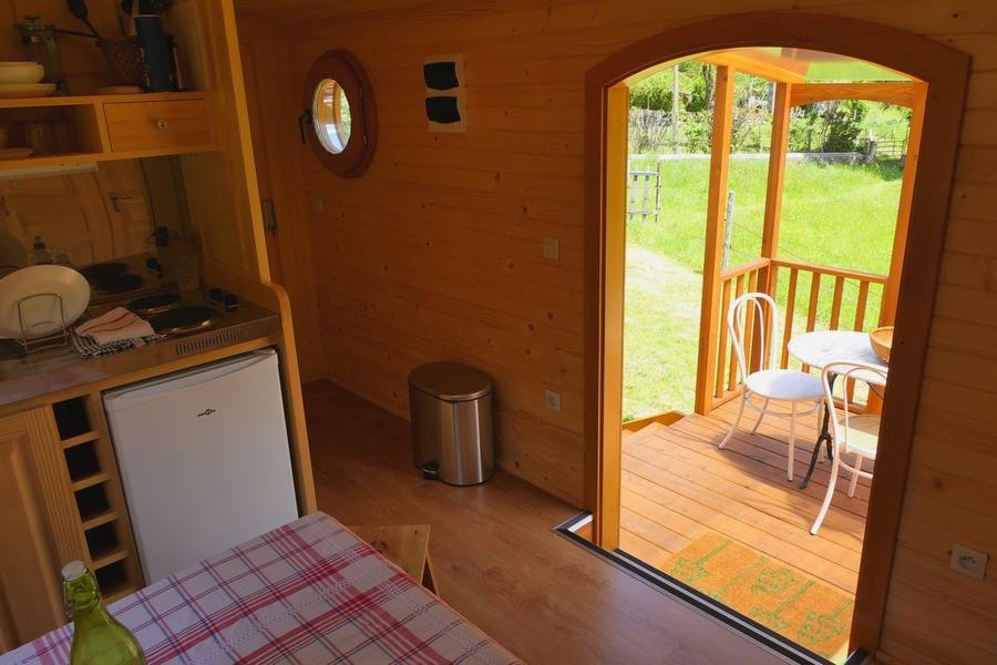 D'une surface de 17,50 m², la roulotte est composée de trois pièces comportant deux chambres (une d'un lit de deux places et une de deux lits superposés) et une cuisine.