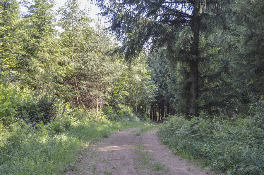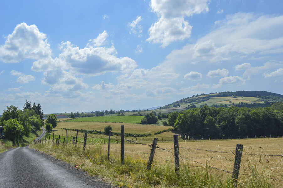 1- Au carrefour des pistes, rester à gauche. Continuer tout droit et passer entre l'ancienne maison du garde-barrière et la laiterie. Continuer tout droit entre les monticules de copeaux de bois et atteindre la route de Saint-Flour.