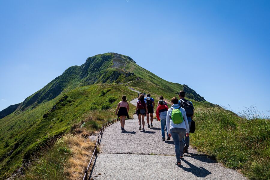 Depuis le col du Pas de Peyrol, trente minutes (195m de dénivelé)* sont nécessaires à pied pour arriver à la table d'orientation située au sommet du Puy Mary. Un sentier aménagé avec marches et contremarches permet d'accéder à l’extraordinaire vue panoramique du stratovolcan : ses vallées glaciaires rayonnantes, ses plateaux d'estives aux formes grossièrement triangulaires et ses puys rocailleux...