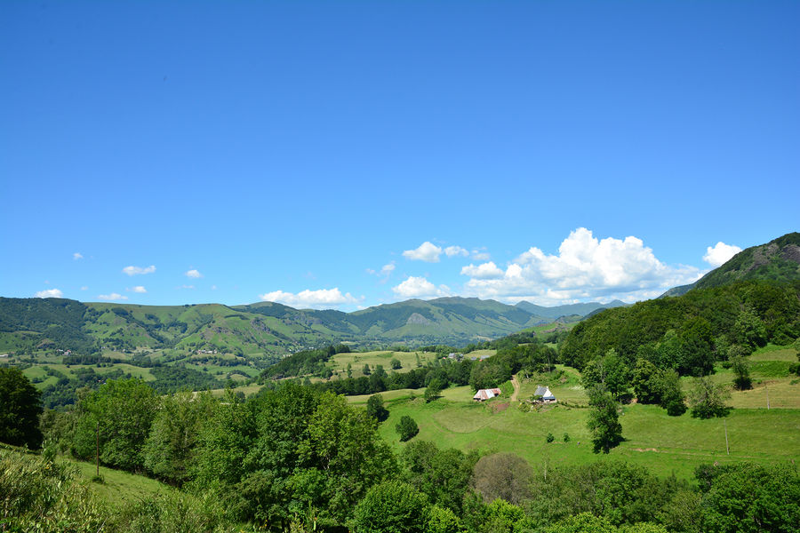 Face à l'église, partez à gauche et traversez un ruisseau sur un petit pont. Après l'oratoire, lorsque vous arrivez à la D17, prenez à droite une belle piste qui se transforme petit à petit en joli chemin dallé et encaissé. Il vous conduit au hameau du Caylat . Arrivé à la route, empruntez-la sur la droite. Ne tenez pas compte des différents croisements et continuez en direction du col de Berganty par la large piste. A la sortie de la hêtraie, prenez pas le premier chemin à gauche. Passez le vallon puis quittez alors la piste en prenant à gauche un chemin montant dans les genêts et longeant à gauche une plantation de résineux. Vous rejoignez un peu plus haut la piste et arrivez dans les estives. Suivez à gauche cette piste herbeuse en montant. Attention, à peine 300m plus loin, quittez cette piste pour un ancien chemin à gauche. Franchissez les clôtures et arrivez aux ruines du lieu-dit le Bos.