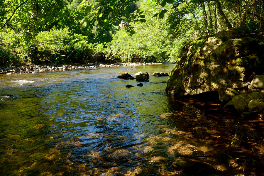 Traversez le hameau et franchissez à droite un portillon. Vous empruntez alors un chemin qui descend vers la vallée. Franchissez une chicane puis continuez à descendre. Quelques mètres plus bas, prenez le sentier sur votre droite, suivez-le jusqu'à un croisement où vous prenez à droite pour rejoindre le ruisseau du Pouget. Traversez le pont et continuez sur une belle piste qui vous permet de rejoindre Saint-Cirgues-de-Jordanne. Au village, après être passé devant l'église, traversez la D17 et empruntez la petite route en direction du col de Légal. Après quelques mètres sur la route, prenez à gauche un chemin qui descend vers les rives de la Jordanne. Traversez un ruisseau sur une passerelle et poursuivez sur cet agréable chemin ombragé jusqu'à Lascelles. Près de l'église, descendez à droite et traversez la Jordanne sur le pont. Suivez ce large chemin à droite. Une centaine de mètres plus loin, prenez à droite un chemin pierreux et encaissé jusqu'au hameau de Cheules où vous retrouvez la route. Empruntez-la sur la gauche et traversez le hameau. Plus bas (environ 200m), à la hauteur d'une grange, engagez-vous dans le chemin à droite. Une cinquantaine de mètres après, prenez à droite dans le chemin qui monte. Après un virage, on passe devant un abreuvoir pour atteindre un pâturage. Dans la pâture, restez à gauche pour passer entre deux mamelons et descendez dans la prairie pour rejoindre un passage dans la clôture que vous traversez.