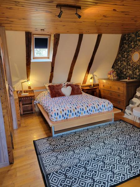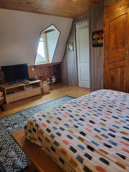 Au 1er étage, une grande chambre avec un lit double, des rangements et la TV. Un cabinet de toilettes avec un autre WC s'y trouve également. Vous trouverz des livres et quelques jeux sur les étagères.