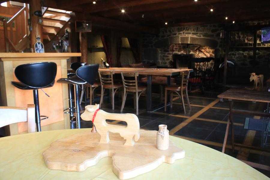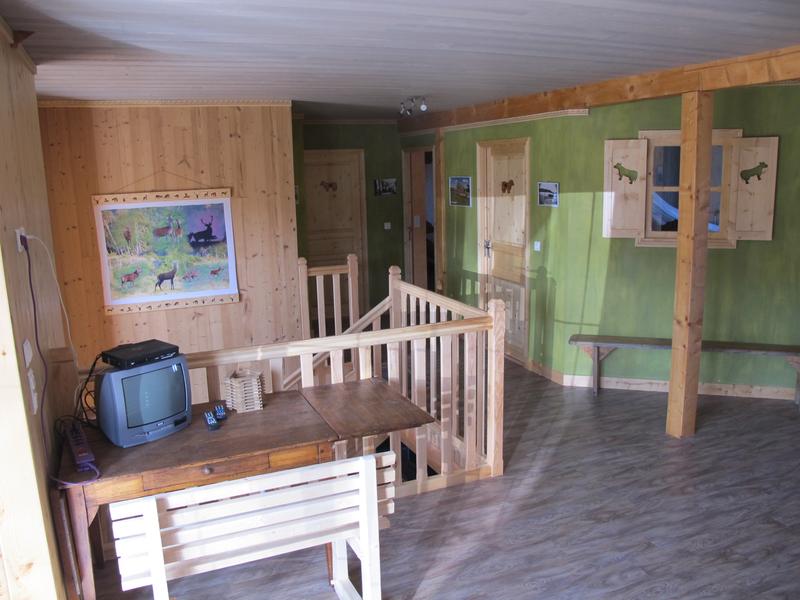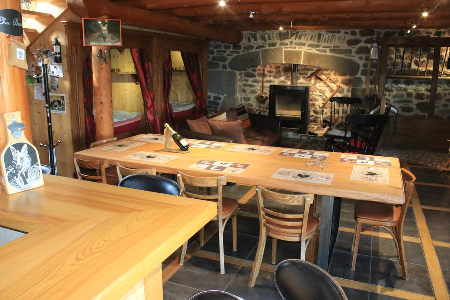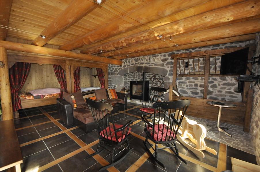 Au RDC : grand séjour/salon avec cheminée équipée d'un poêle à bois, cuisine américaine et couchages en alcôve (1 lit 140×190 et 1 lit 90×190) ; salle d'eau avec douche et WC indépendant.