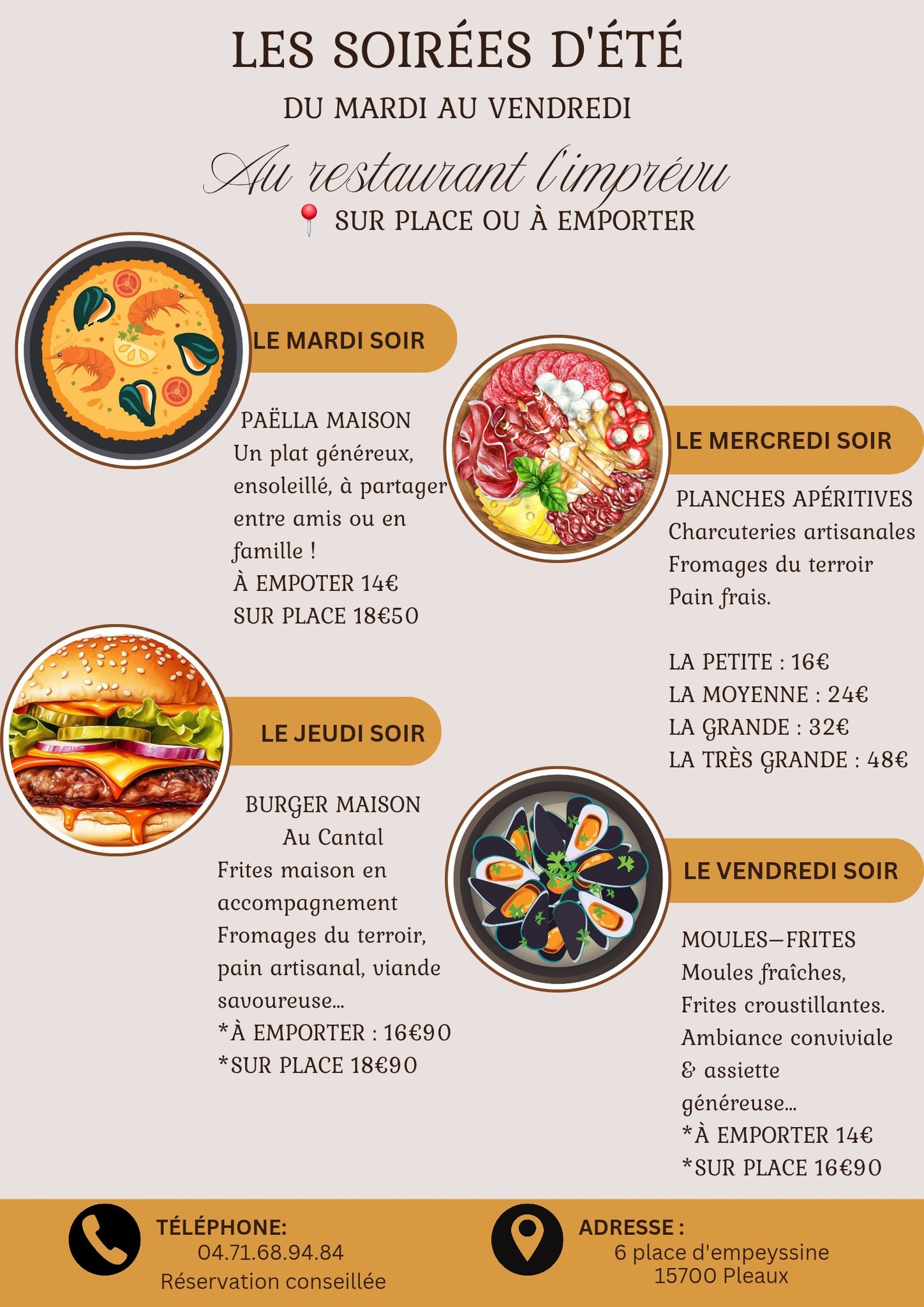 L’Imprévu propose aussi des soirées à thème, la retransmission d’événements sportifs, ainsi que la privatisation du restaurant pour vos moments sur mesure.
