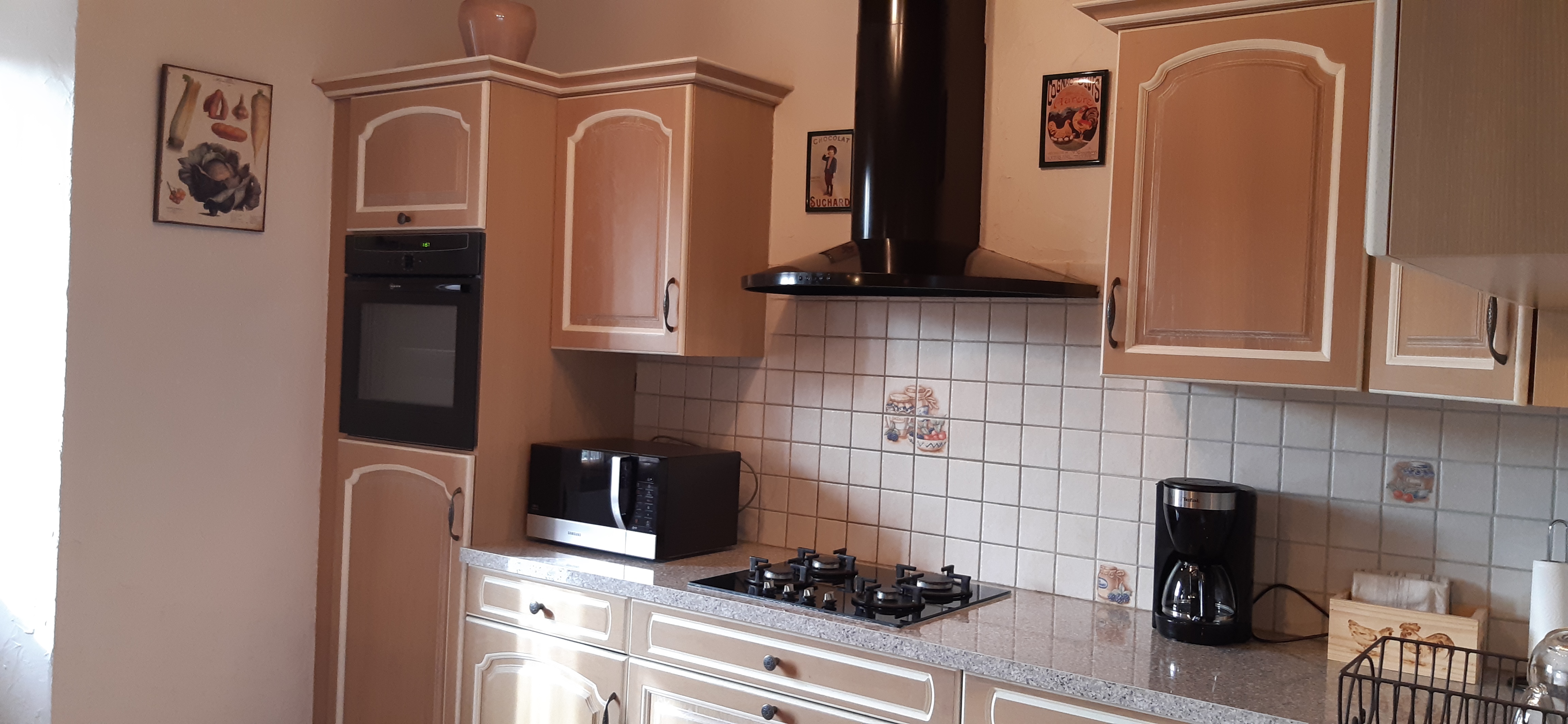 Au RDC, cuisine intégrée, séjour avec poêle à bois, TV, lecteur DVD, coin bibliothèque, WC indépendant.