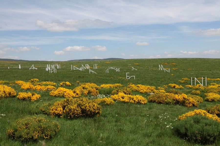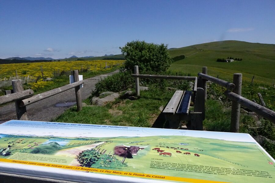 Ce sentier sur le plateau vous offrira de superbes vues sur le grand volcan cantalien, sans trop de dénivelé. Prenez le temps d'admirer ces sculptures blanches métalliques qui ornent le chemin.