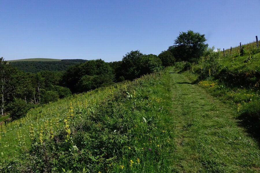 Après la hêtraie, en sortant du bois, prenez à droite pour remonter dans les pâturages jusqu'à la clôture, que vous allez longer à main gauche en montant.