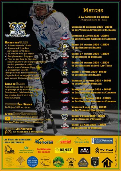 Venez vibrer et soutenir les Mouflons du Lioran lors de leurs matchs de hockey sur glace à la patinoire.