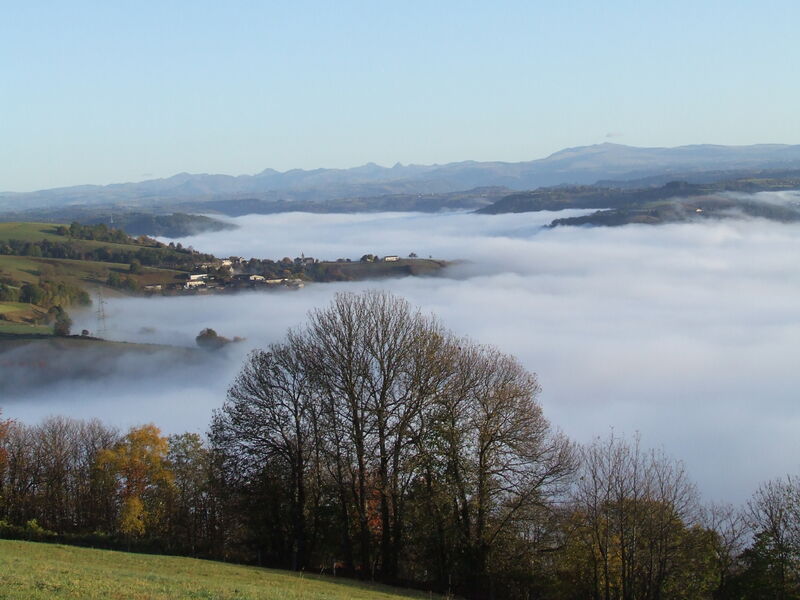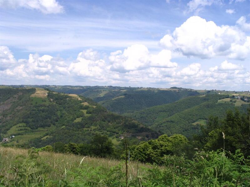 Panorama sur la Vallée du Goul, l'Aubrac et les monts du Cantal.