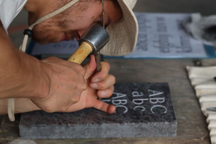 Paul Trigueiro Pires est graveur sur pierre à Loupiac gare. Il travaille aussi bien pour des stèles nominatives, funéraires par exemple, ou pour des objets décoratifs.
