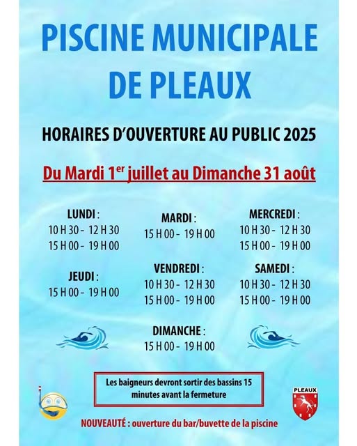 Le maître-nageur de la piscine municipale de Pleaux vous propose une ouverture de juillet à août. La piscine est chauffée mais non couverte.