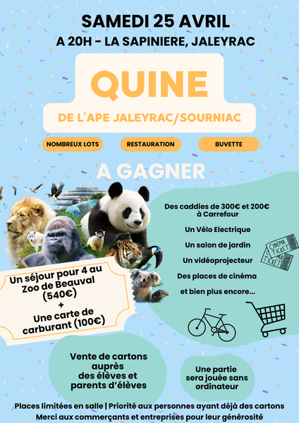 1 séjour pour 4 pers au zoo de Beauval (+ 1 carte carburant de 100 €) – 2 caddies de Carrefour Market (1 de 300 € et 1 de 200 €) – 1 vélo électrique… et de nombreux lots à gagner. Buvette et pâtisseries