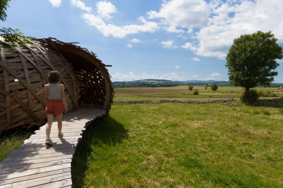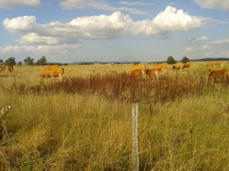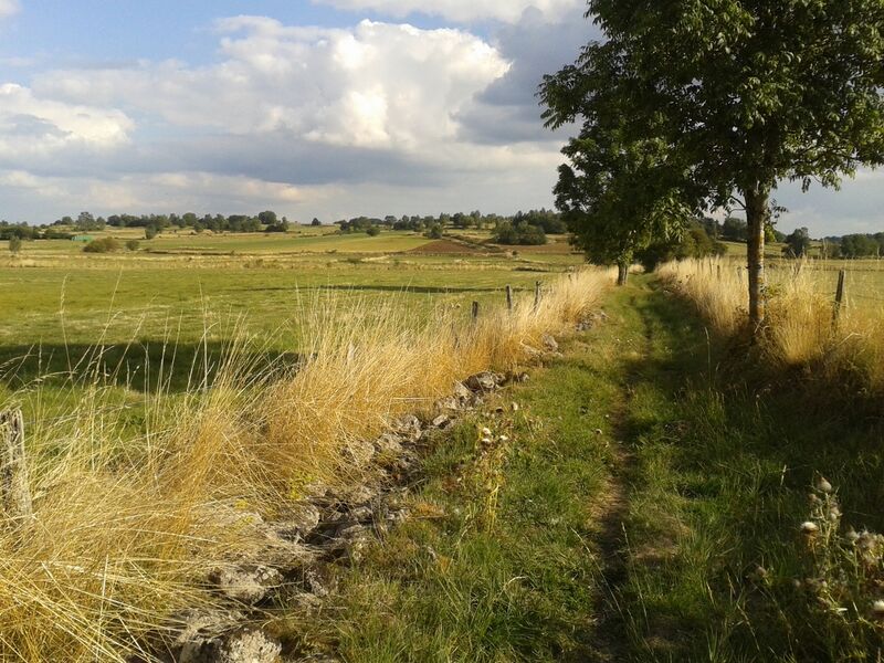 2- Borne B. Tourner à droite en direction de La Salesse. Vue sur la Margeride et l’église de Cussac. Ignorer un embranchement à droite. Continuer tout droit au premier croisement, à l’entrée du village ; au second, tout de suite après, prendre à droite.