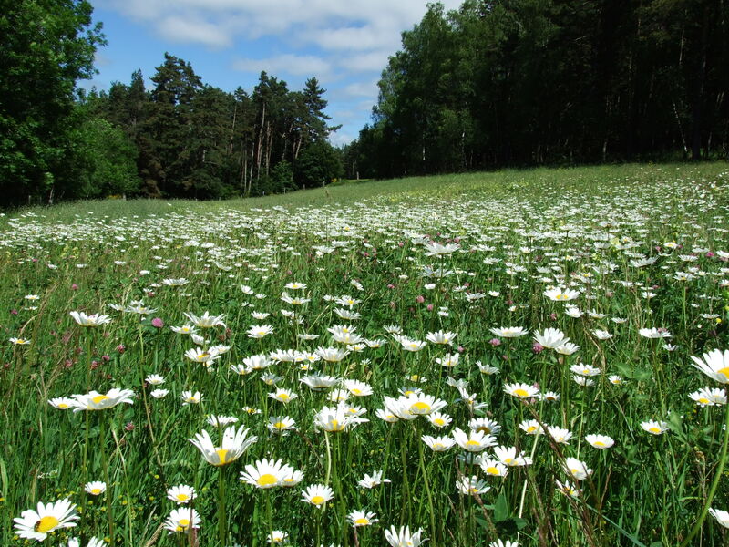 8) 200 m après le calvaire, prendre le chemin à gauche : il monte et longe une prairie, (ne pas suivre le balisage jaune). Passer en sous-bois et rejoindre une route.